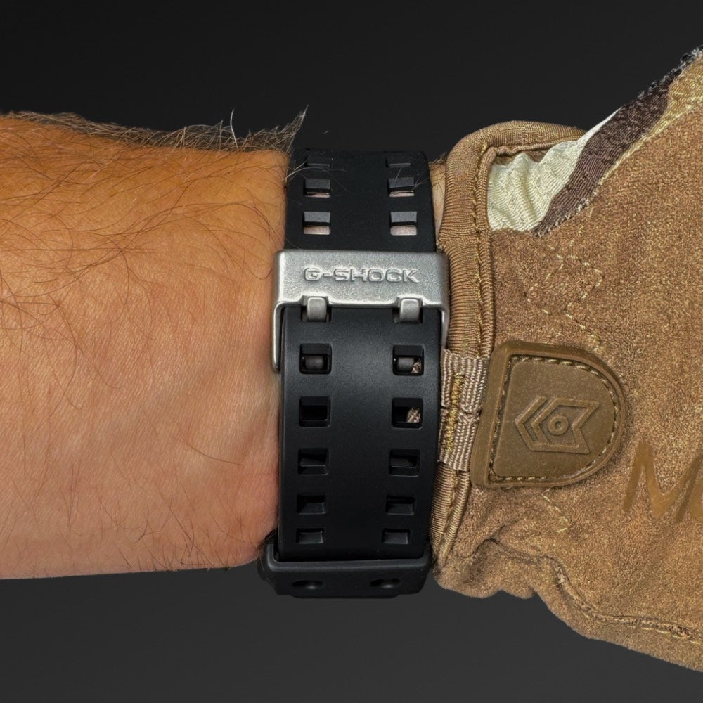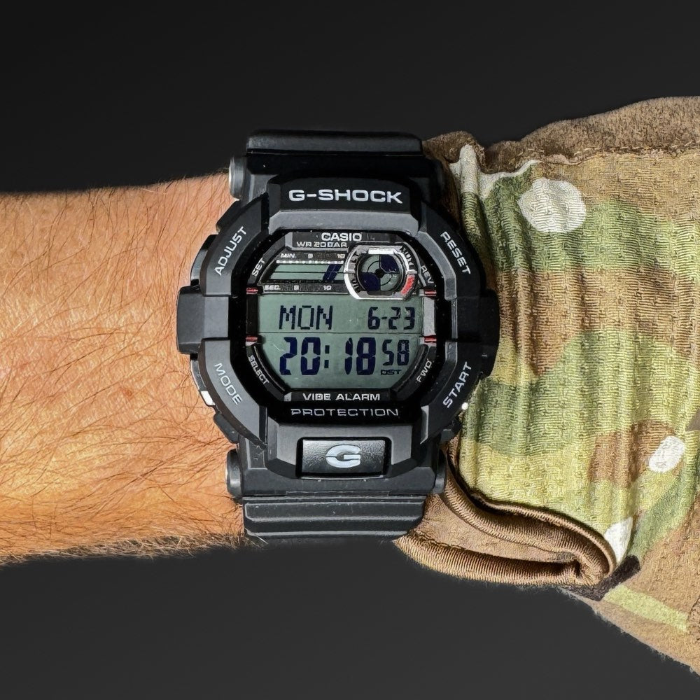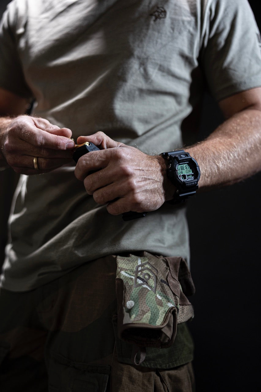 Digital watch for military use with black strap/case. Large buttons, easy to press with gloves. Stopwatch, countdown timer and alarm with vibration notification. Shockproof. Button-activated light on display. Waterproof to 200 m depth. Weight: 75 g. Battery life: approx. 5 years. Case size: 53.4 × 50.8 × 18 mm.