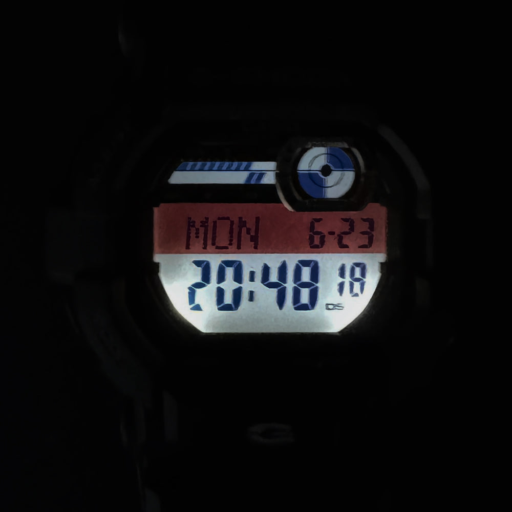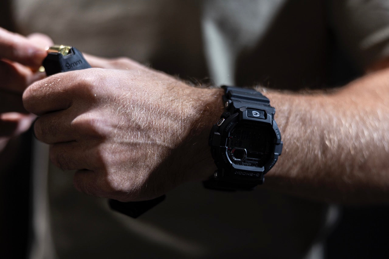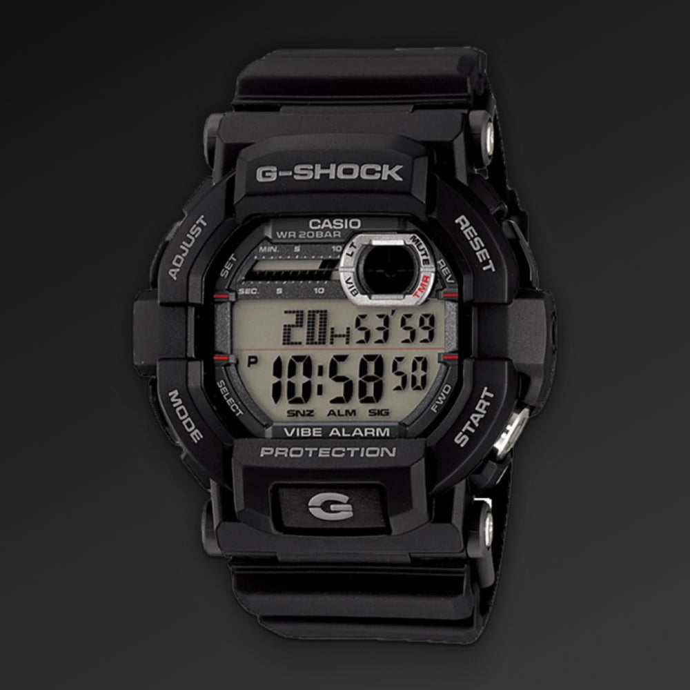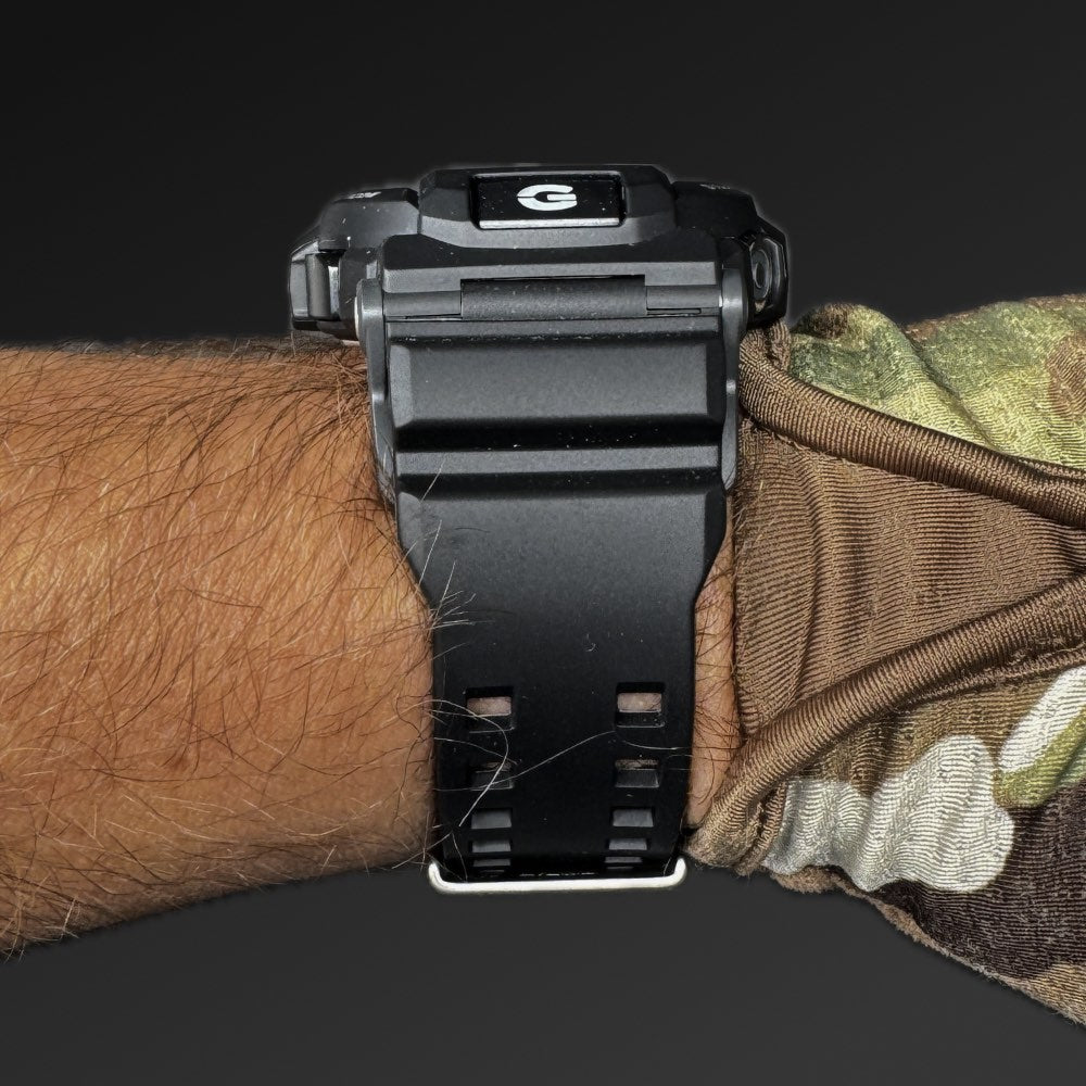 Digital watch for military use with black strap/case. Large buttons, easy to press with gloves. Stopwatch, countdown timer and alarm with vibration notification. Shockproof. Button-activated light on display. Waterproof to 200 m depth. Weight: 75 g. Battery life: approx. 5 years. Case size: 53.4 × 50.8 × 18 mm.
