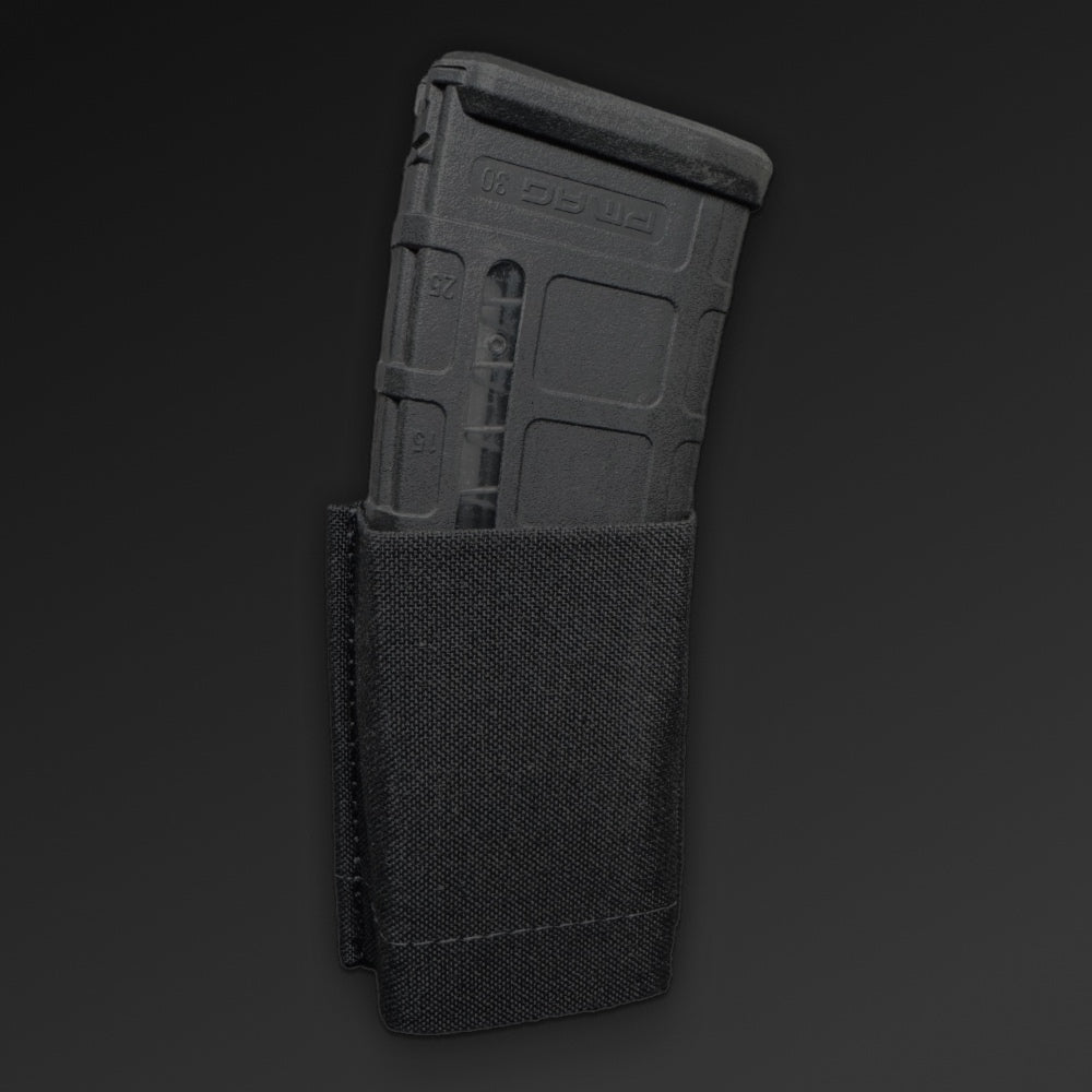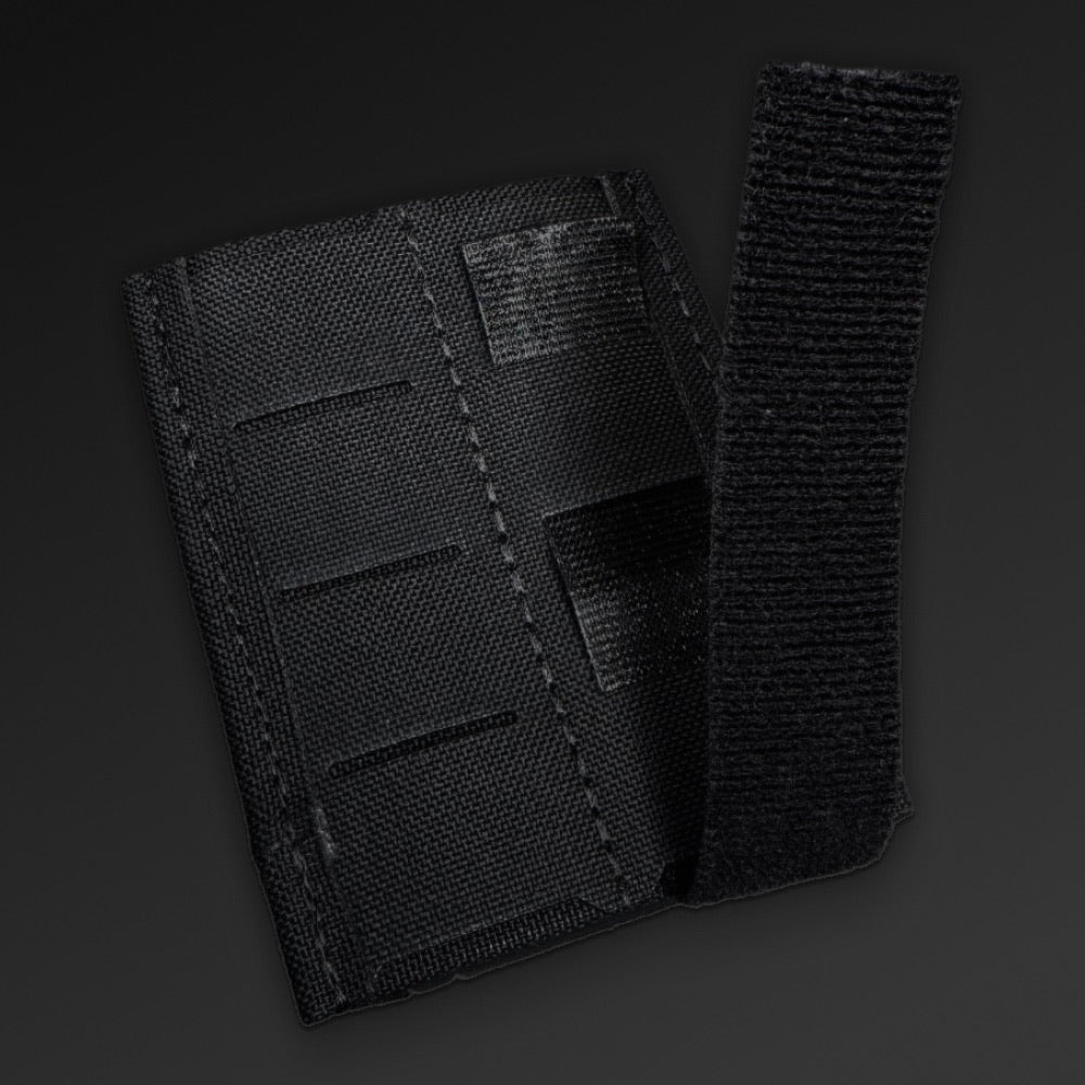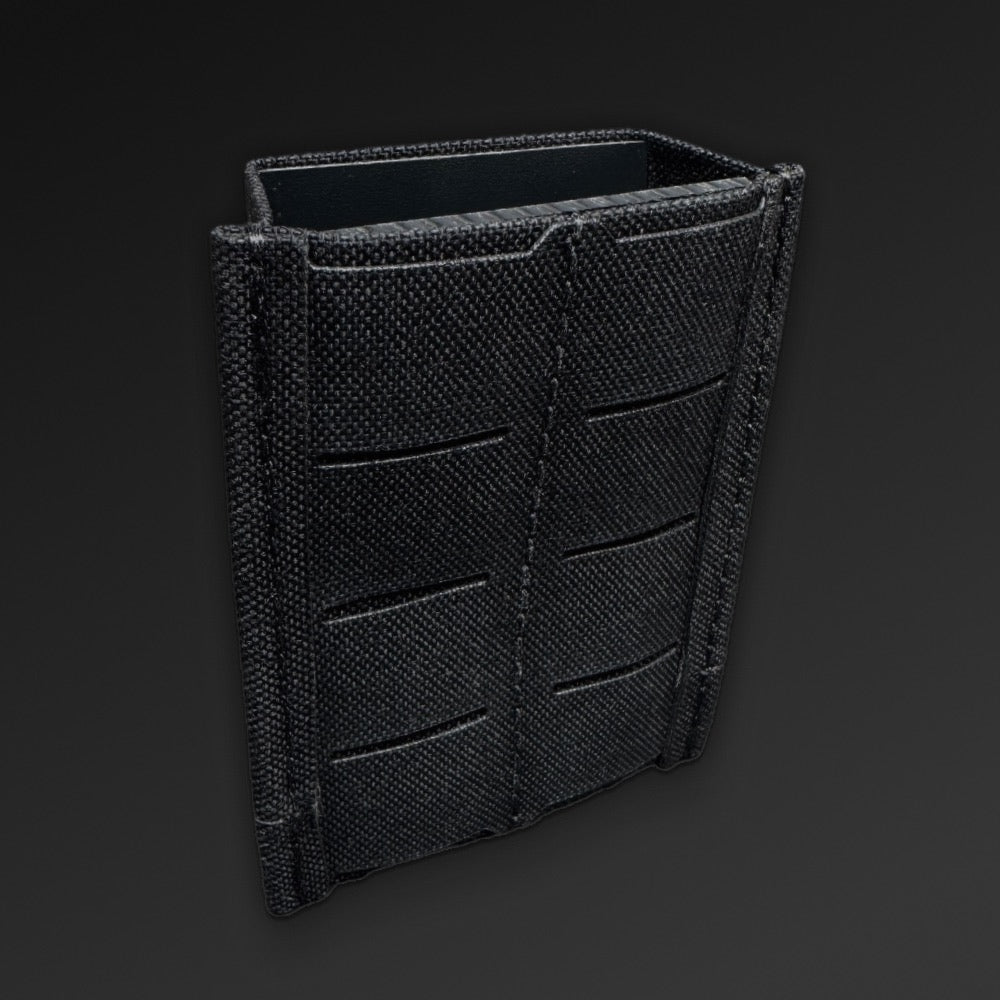 Black color. The pouch holds one magazine. Laser cut molle panel on the back. 2 pcs. One Wrap attachment straps are included.
