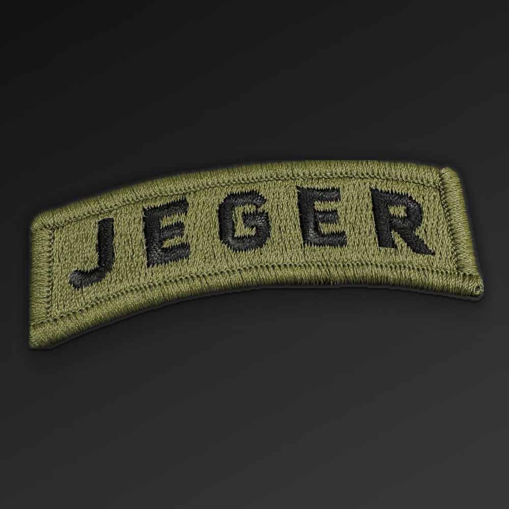 Jeger tab patch with velcro. Olive green with black text. Non-reflective. Available in embroidered and laser cut.