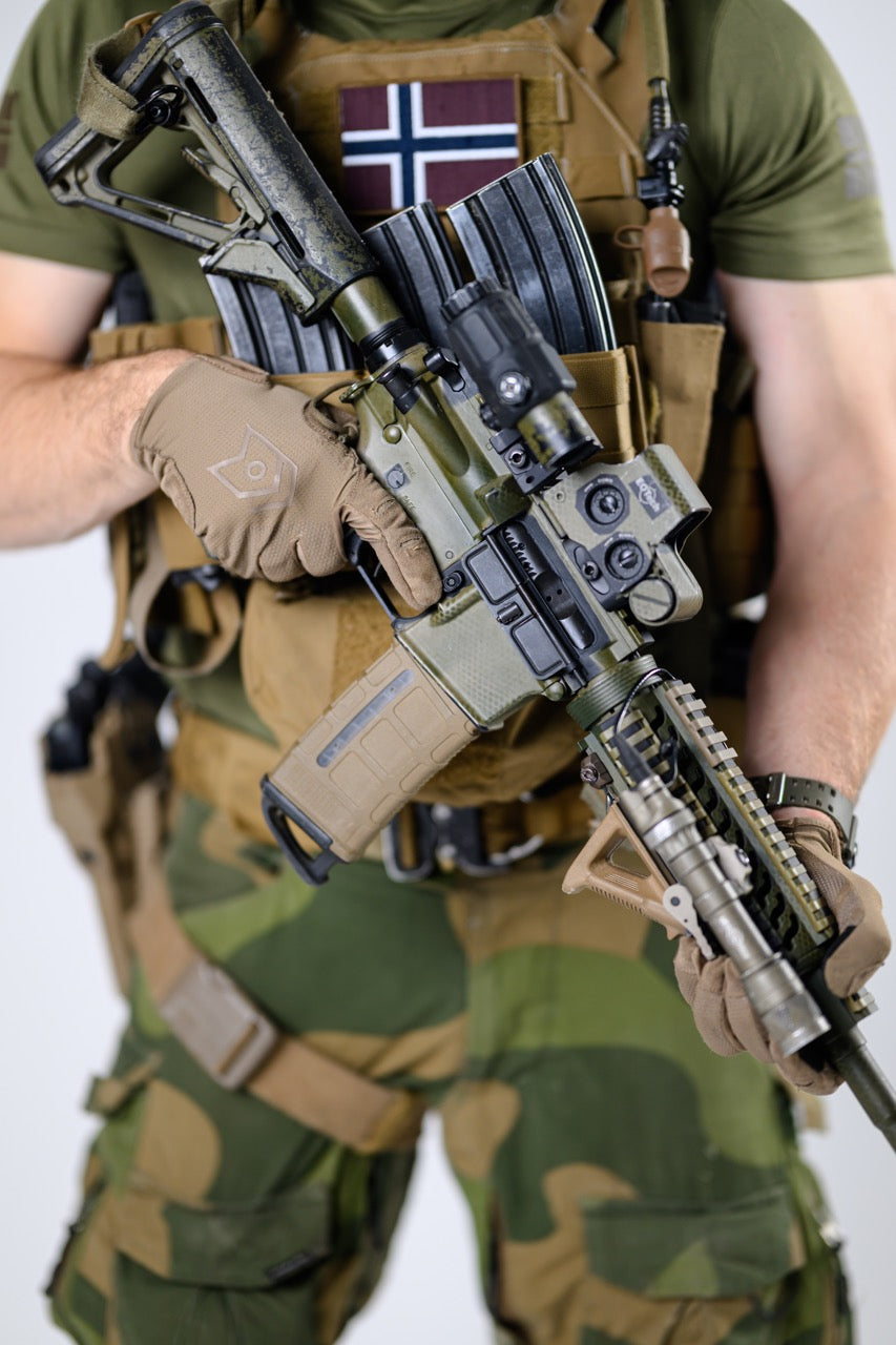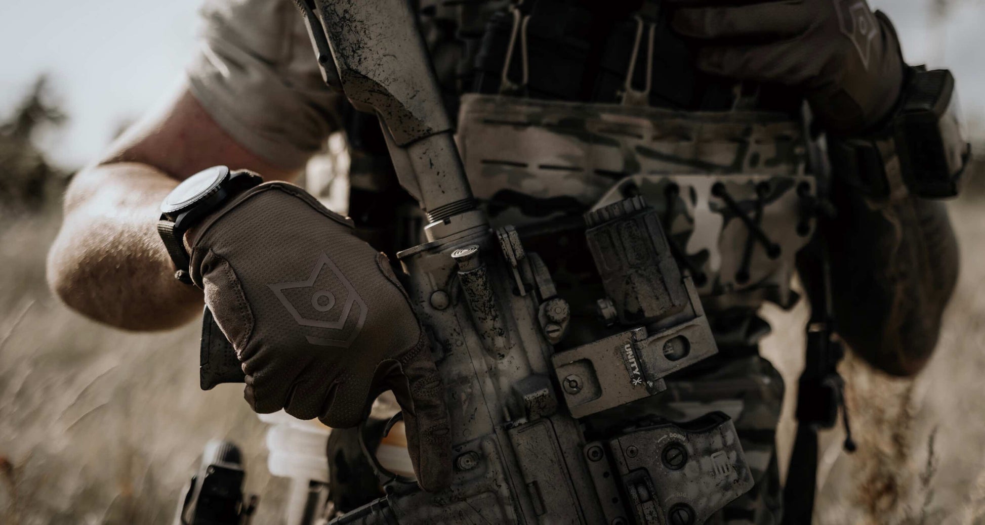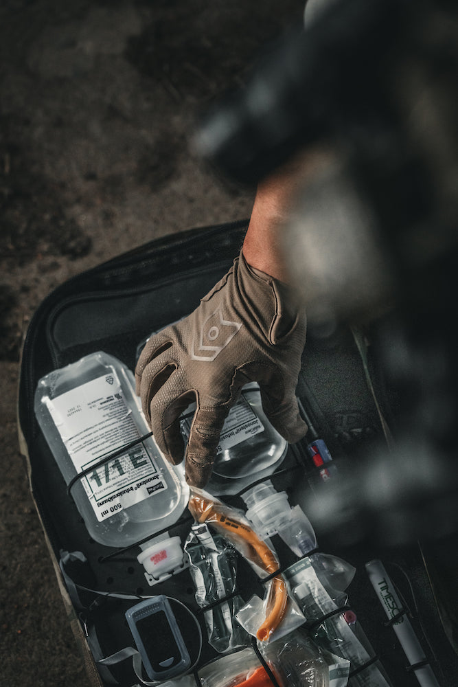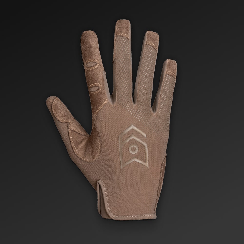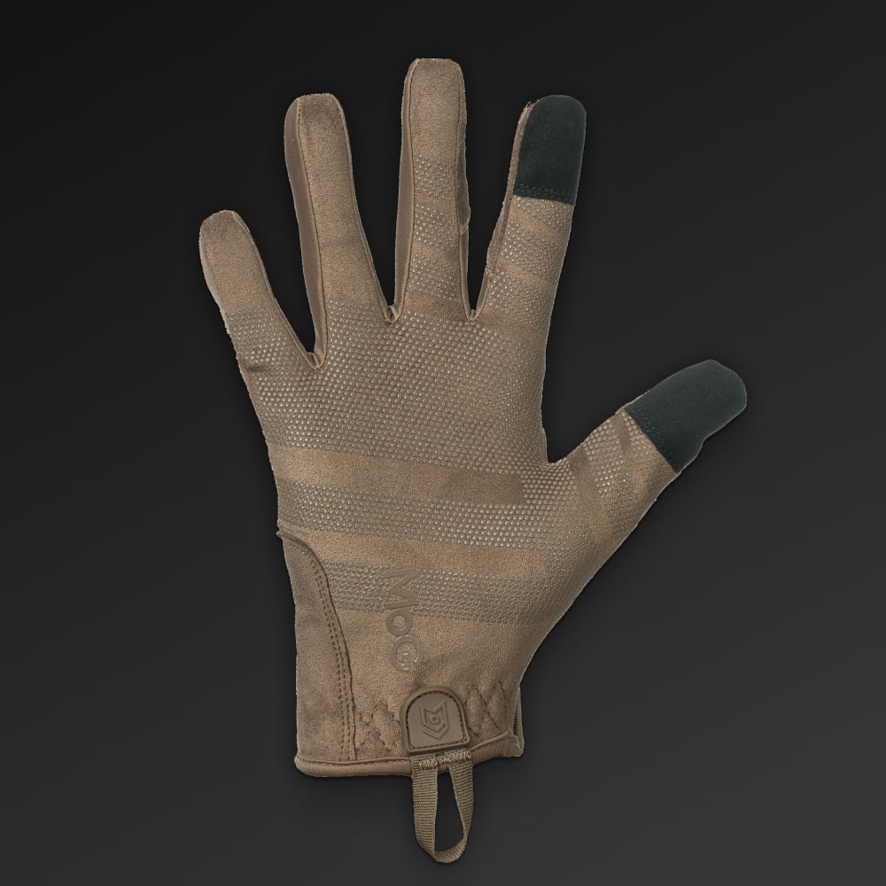 Tactical glove from Masters of Gloves. Thin glove for high tactility when handling weapons, and sewn with two joints on the trigger finger for full flexibility. Silicone texture in the palm for good weapon grip. Touchscreen compatible and with strap to attach to kit.