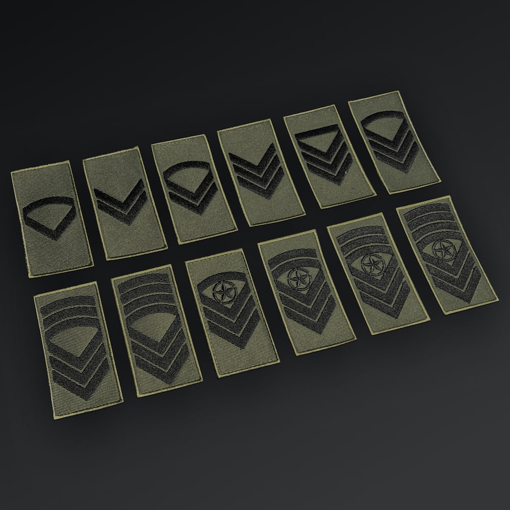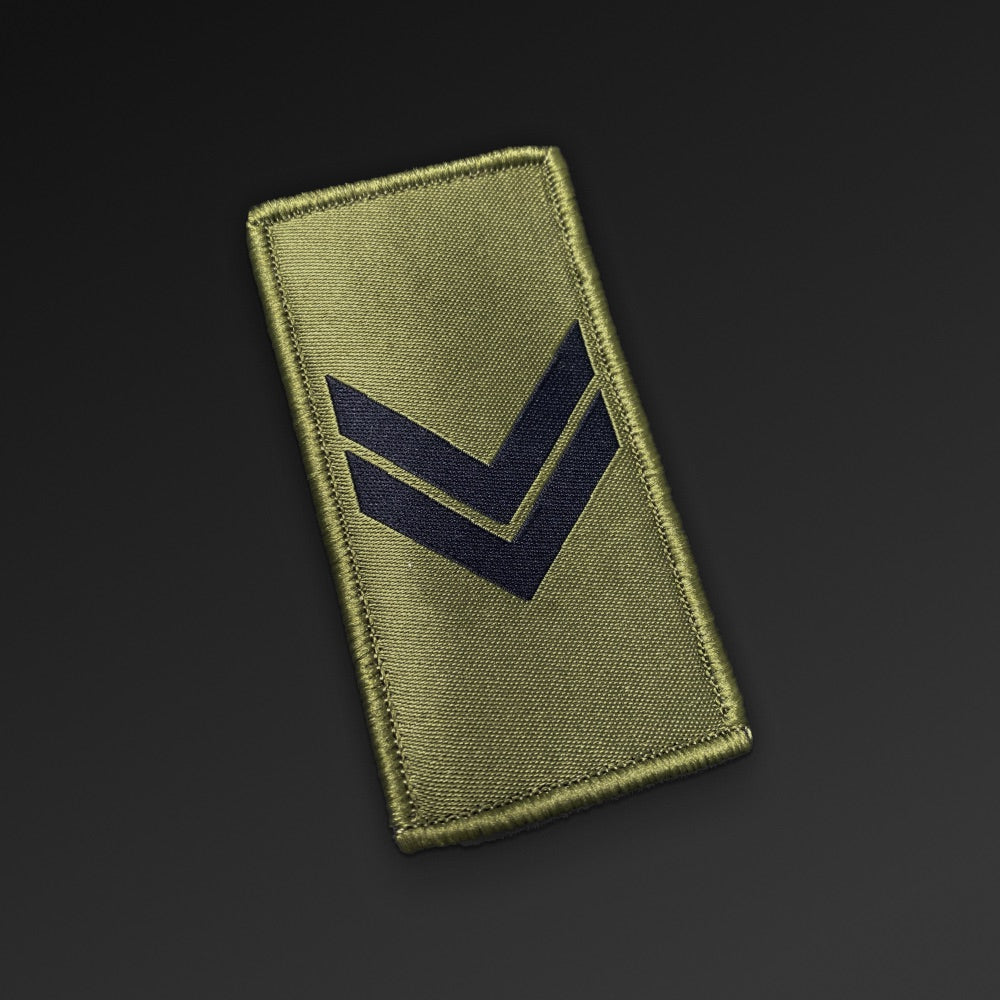 Rank insignia with velcro backing. Olive green and black, embroidered and woven. All OR ranks. Size: 38 x 75 mm.