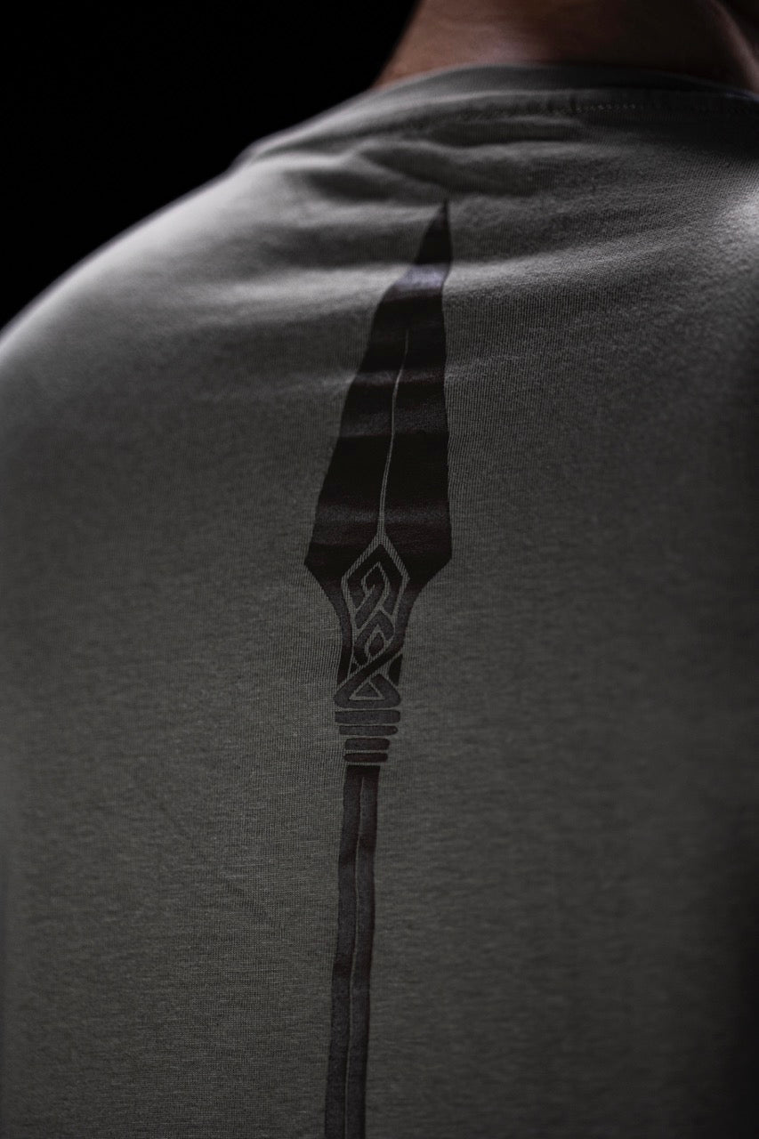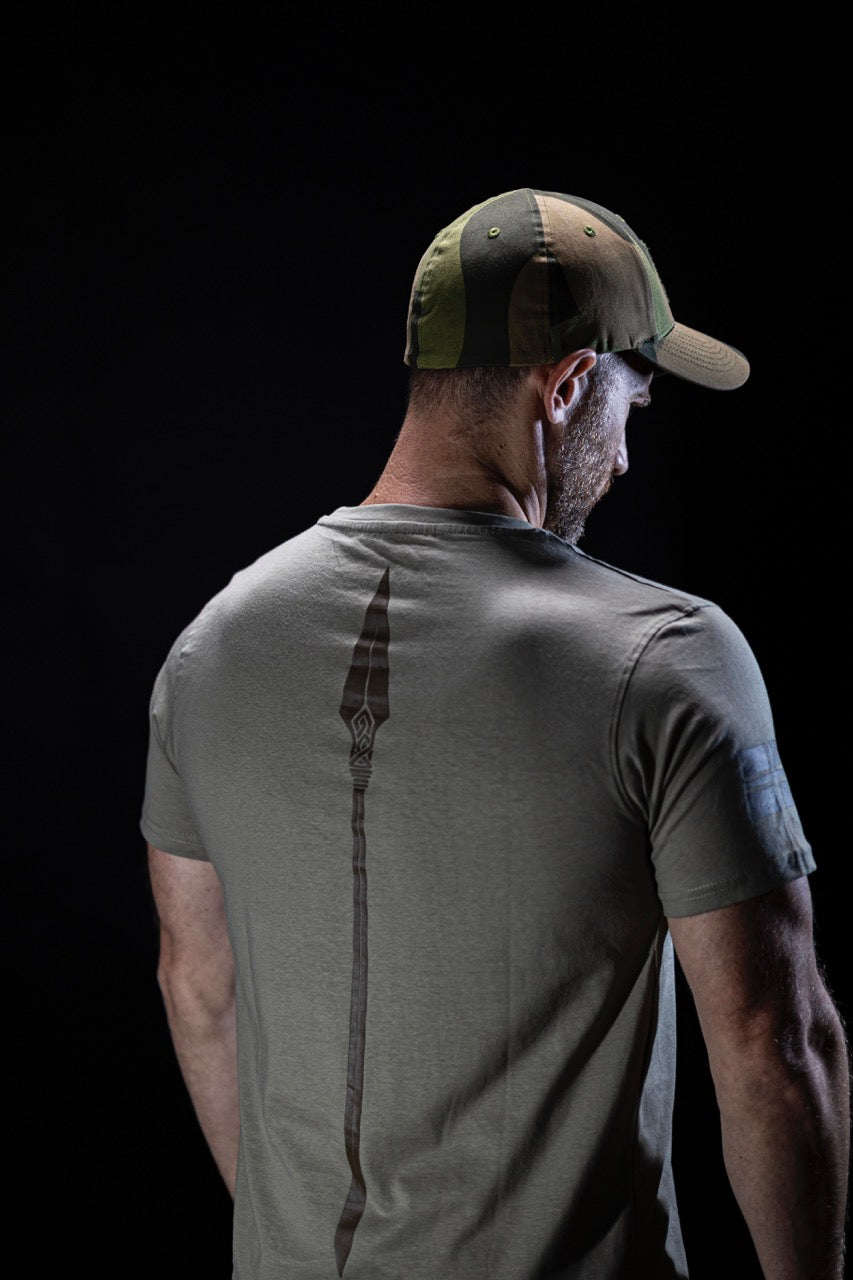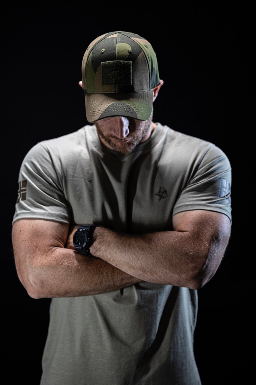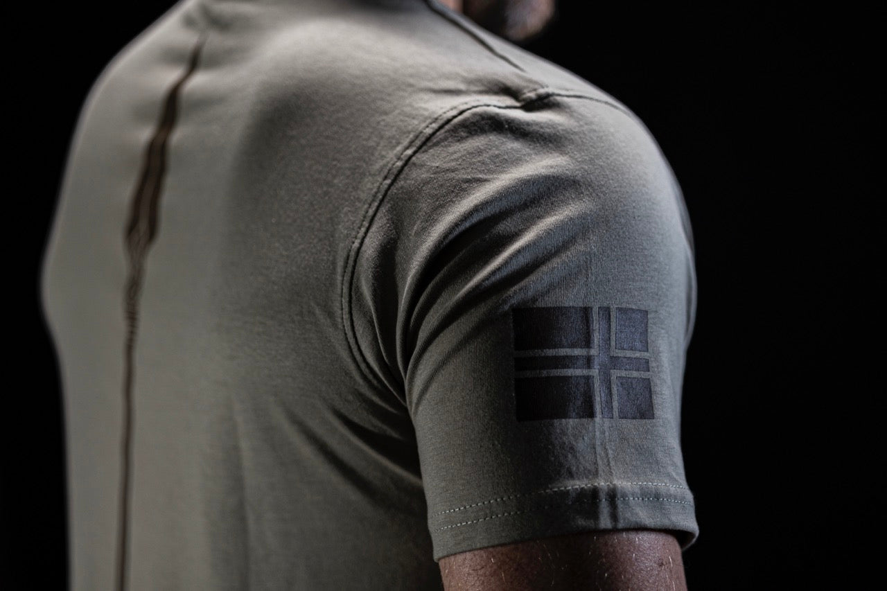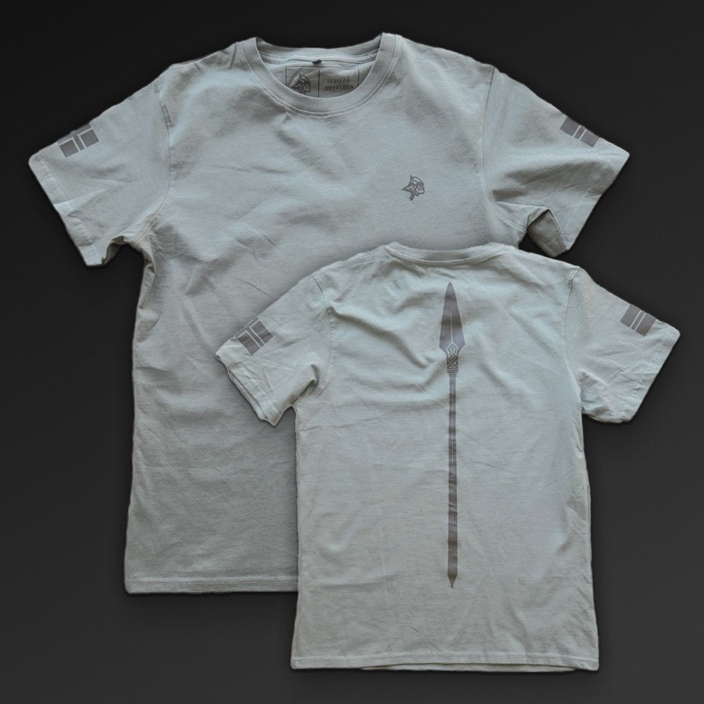 T-skjorte til arbeid og fritid. Lys, olivengrønn farge med norsk flagg på begge ermer og Odins spyd på ryggen. 100 % bomull. Sjekk størrelsesguiden for å velge størrelse.