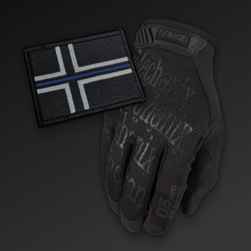 Svarte Covert hansker fra Mechanix og Thin Blue Line patch i rabattert pakkepris.